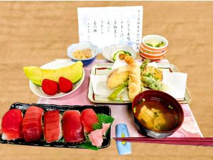 【握り寿司(赤身、中とろ)・すまし汁・茶碗蒸し・天麩羅(カニ、アスパラガス、菜の花、さつま芋、リンゴ)・蓮根のきんぴら・フルーツ・香の物】
